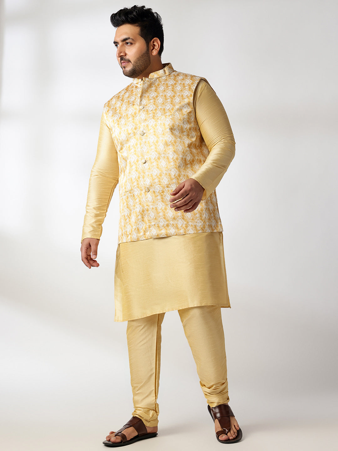 Men's Silk Blend Gold Kurta & Pyjama With Printed Yellow Nehru Jacket