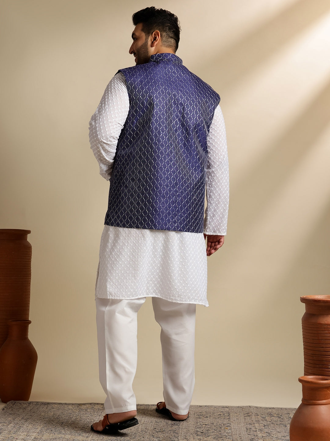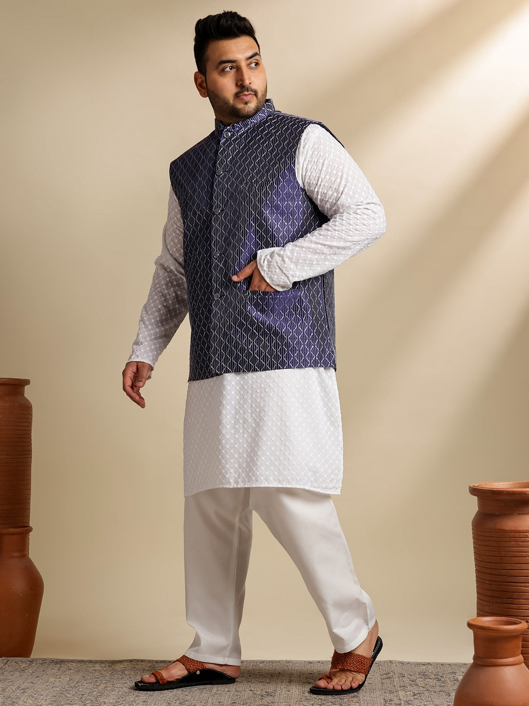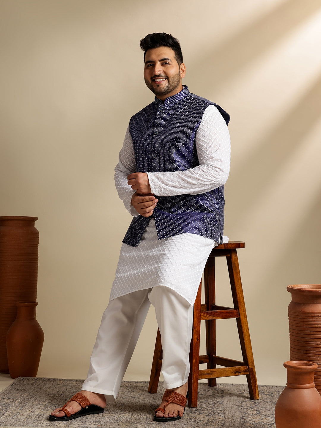 Sojanya Plus (Since 1958) Men's Cotton White Chikankari Kurta & Pyjama With Navy Nehru Jacket