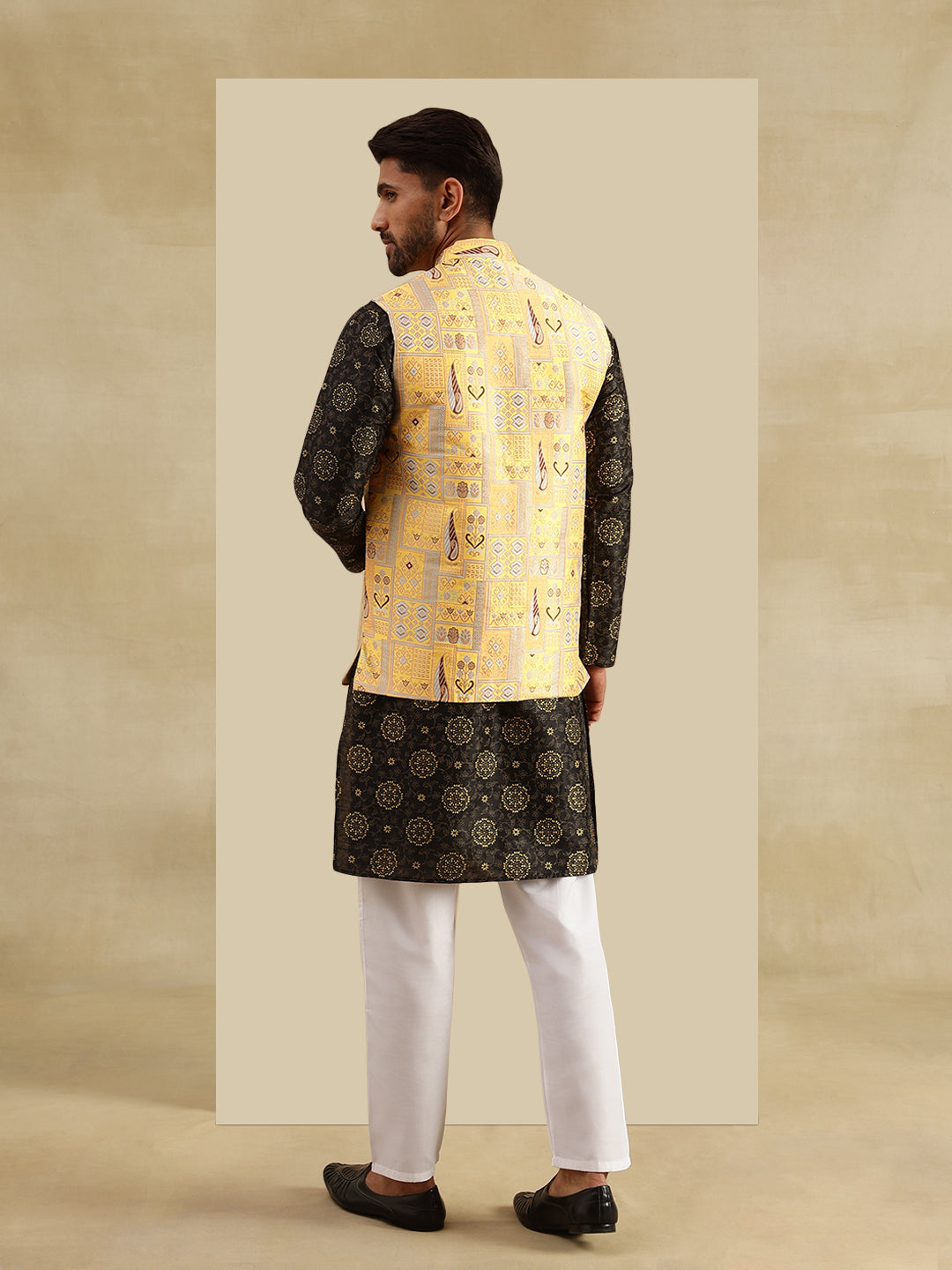 Men's Silk Blend Black Kurta & White Pyjama With Jacquard Silk Yellow Nehru Jacket
