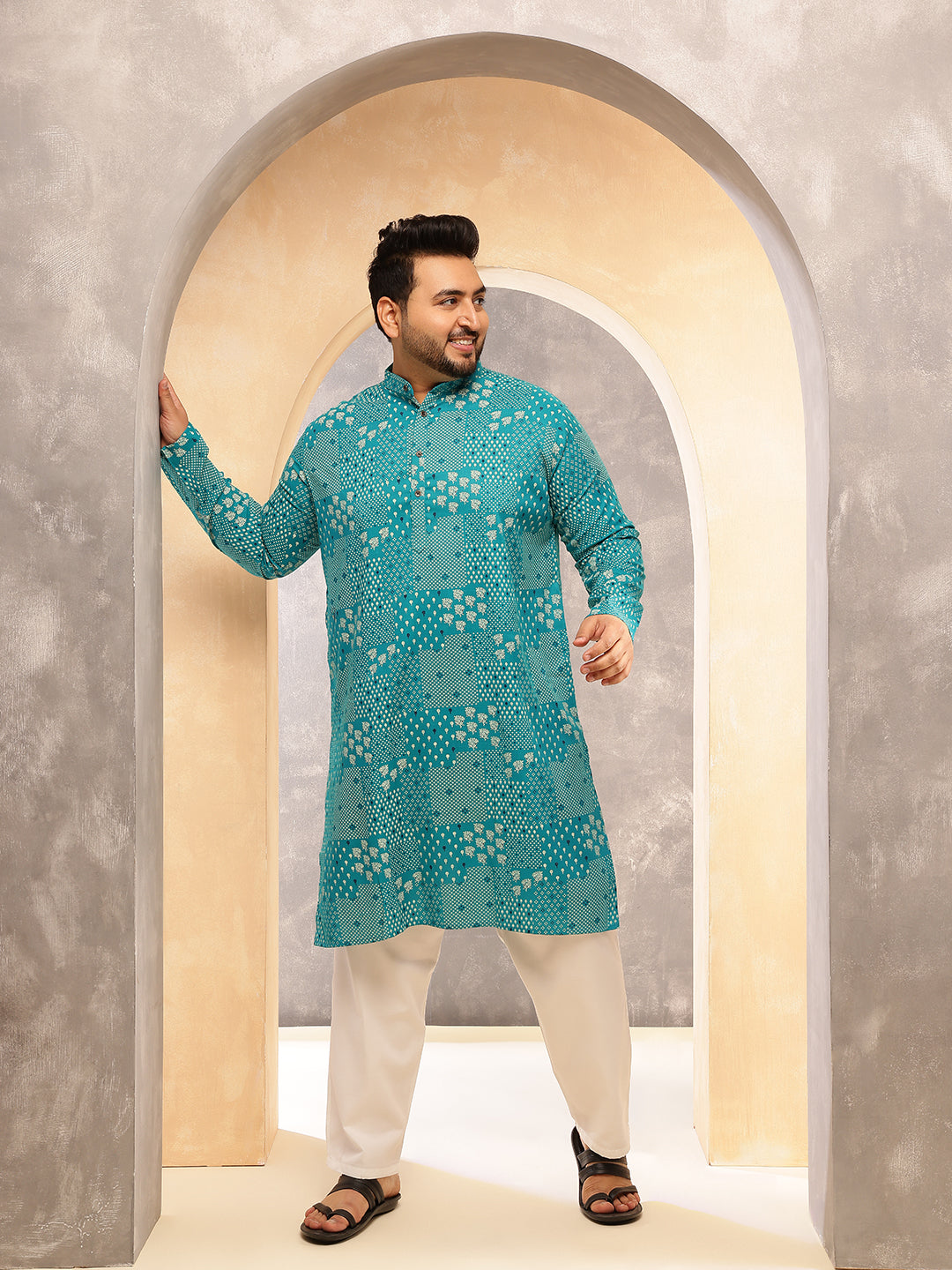 Men's Cotton Blend Sanganeri Printed Blue Kurta With White Pyjama