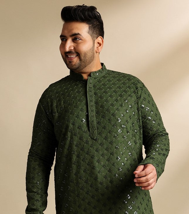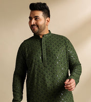 Men's Cotton Floral & Cross-Stitch Sequins Embroidered Green Long Kurta