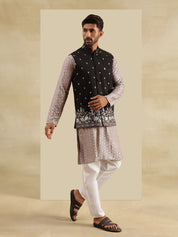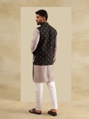 Men's Cotton Rayon Brown Kurta & White Pyjama With Daman Embroidered Black Nehru Jacket