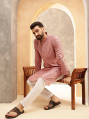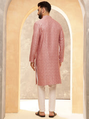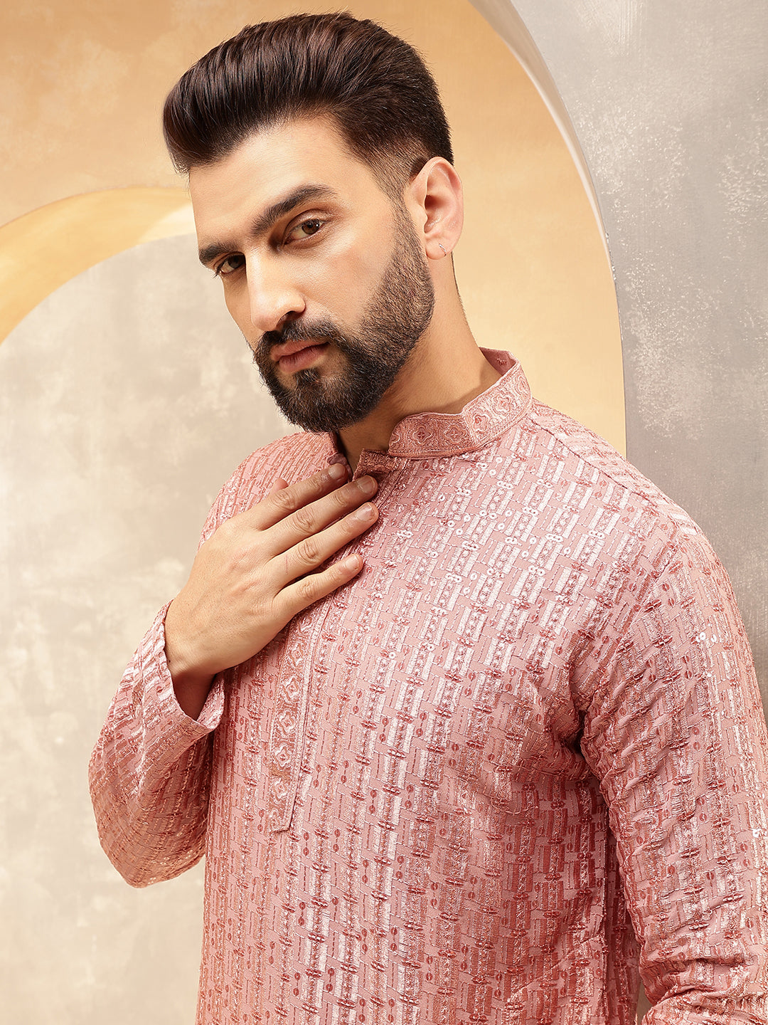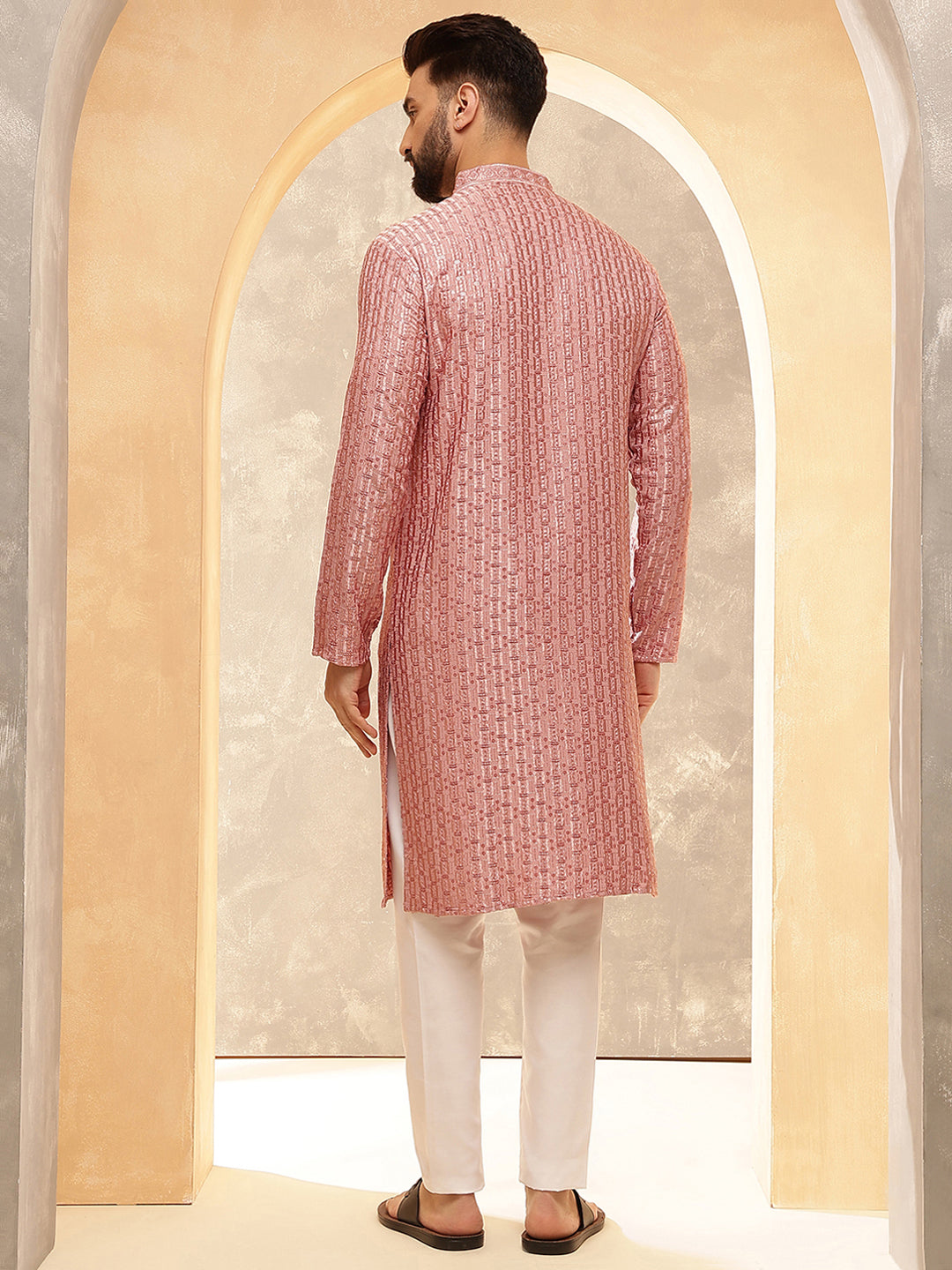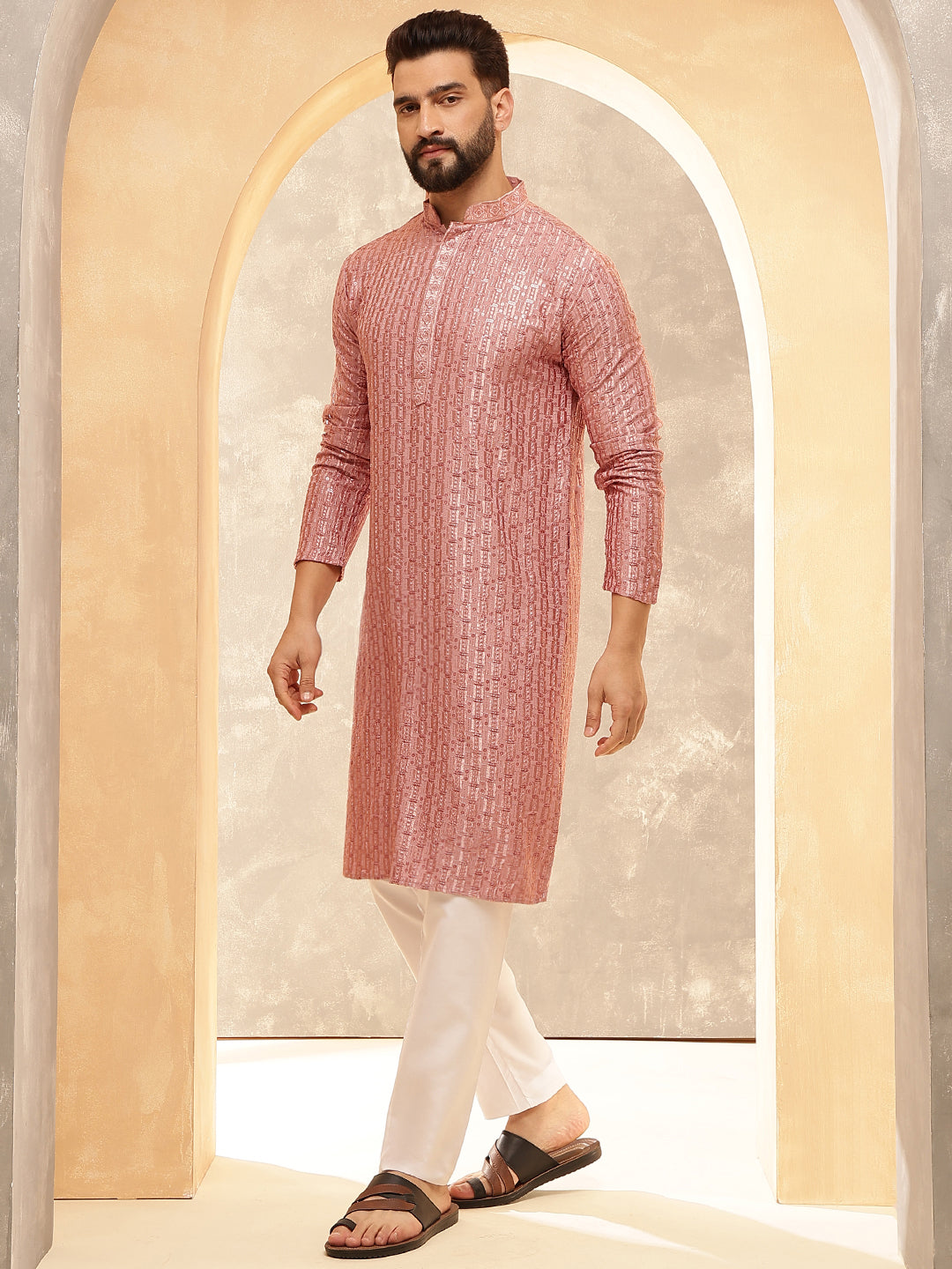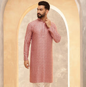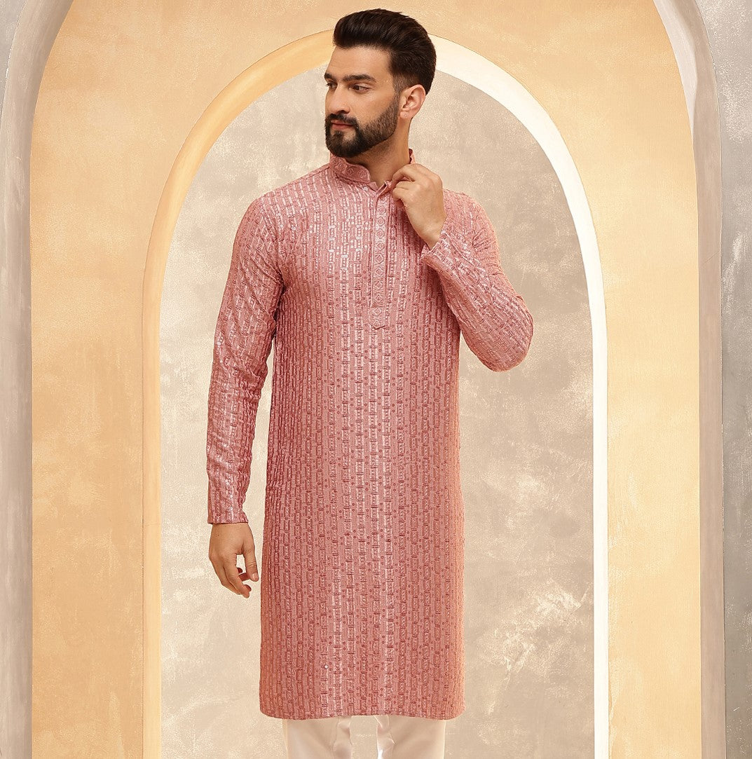 Men's Cotton Rayon Shiny Thread Sequinned Coral Only Long Kurta