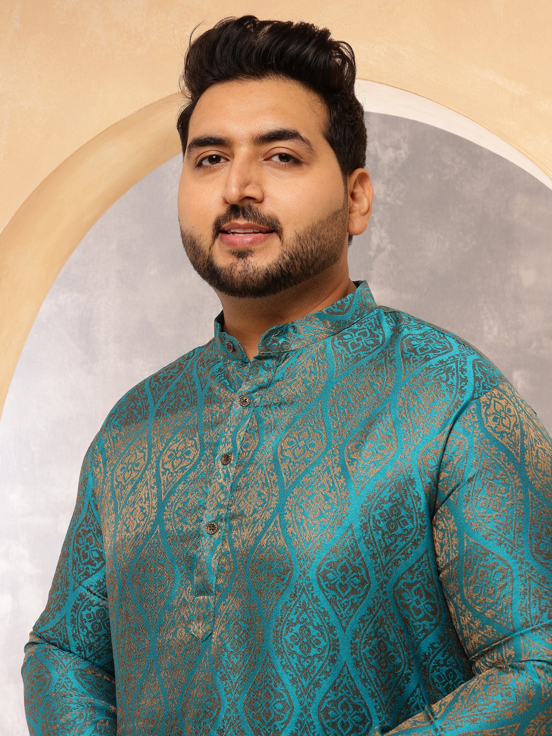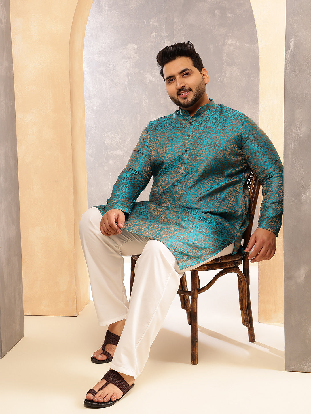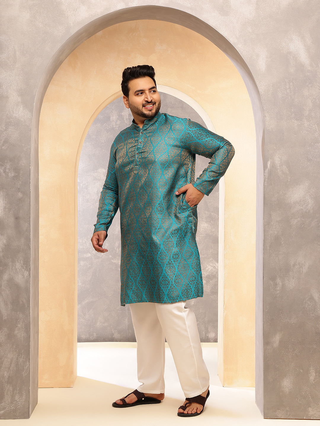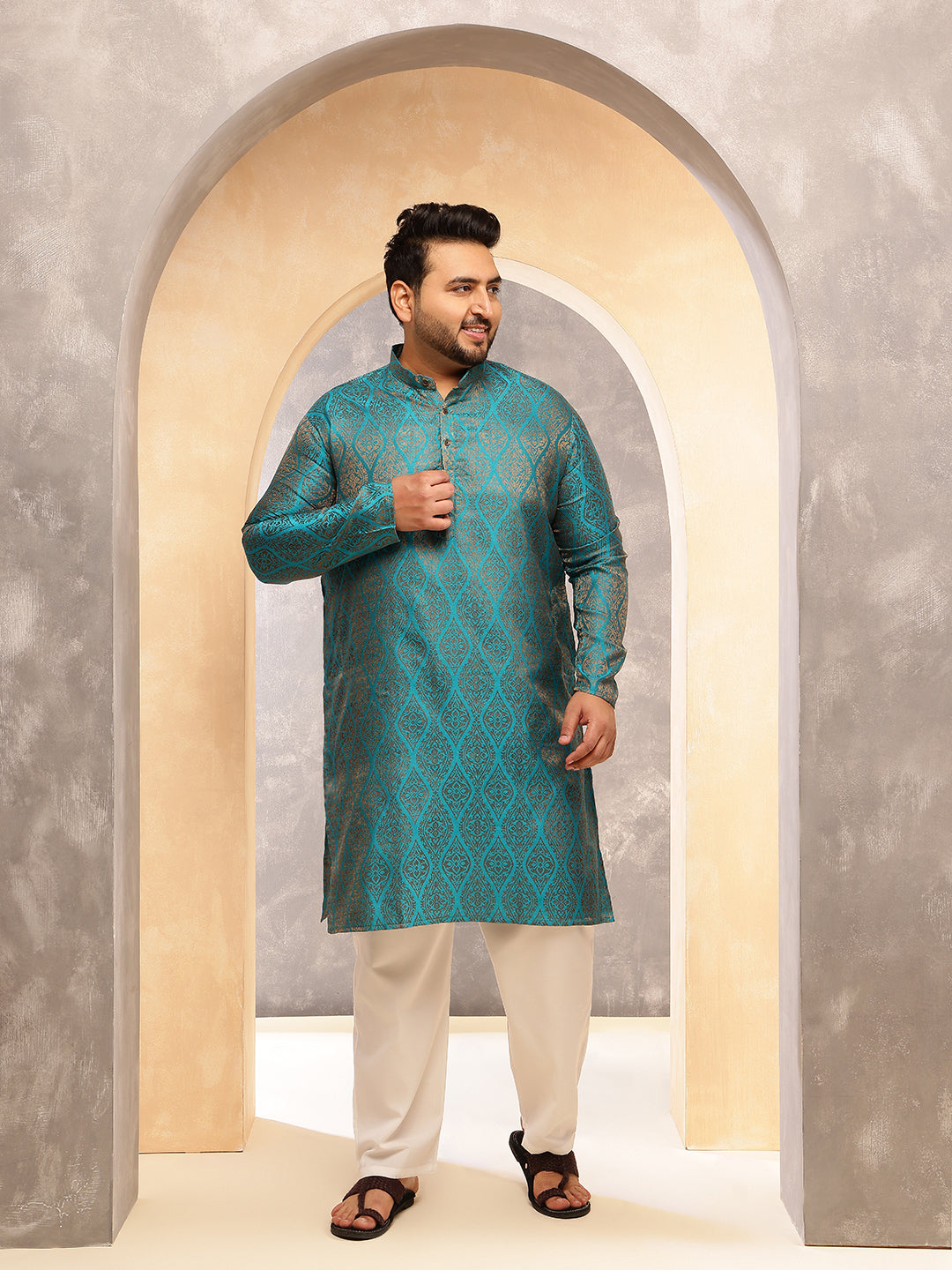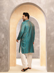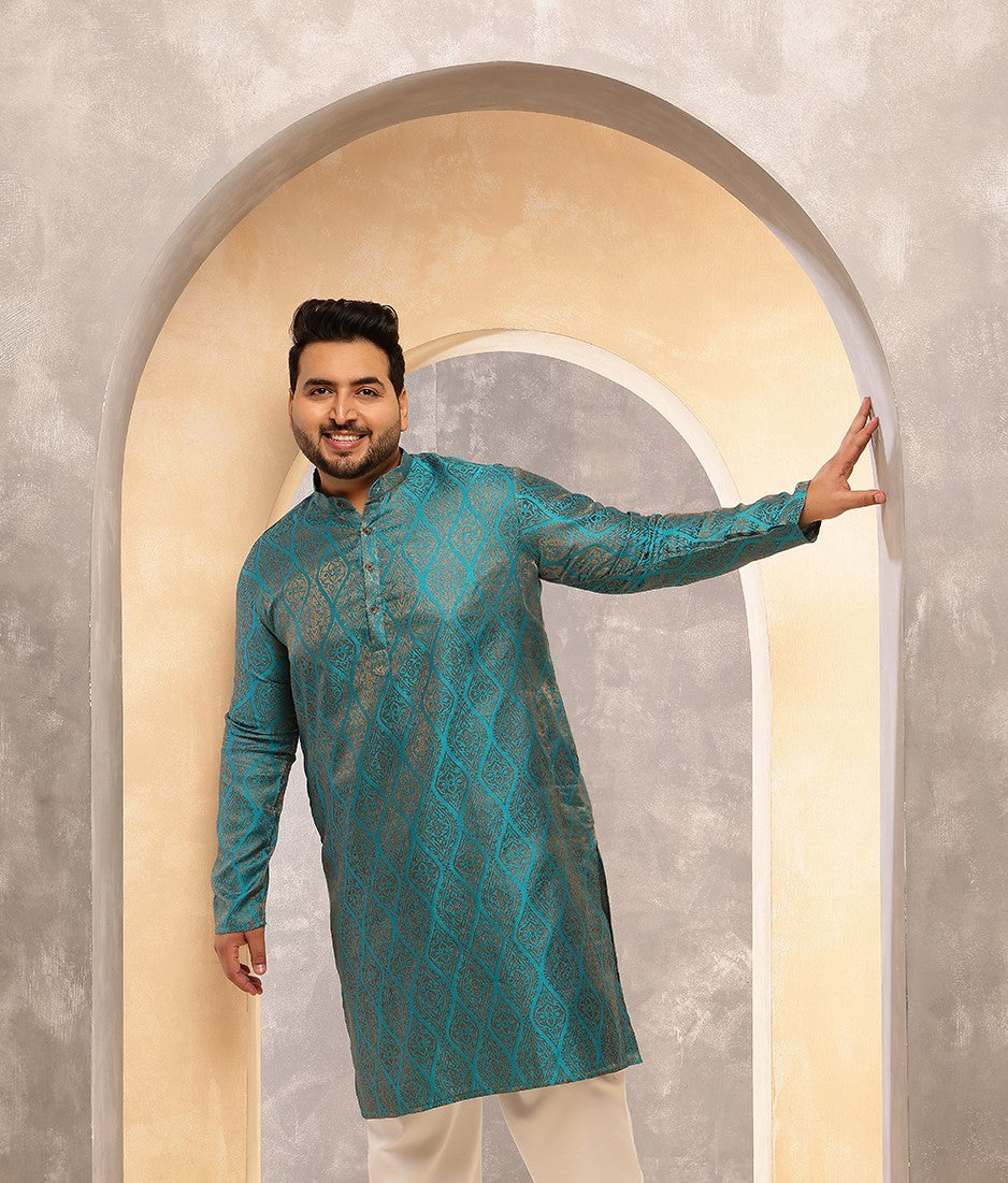 Men's Jacquard Silk Teal Blue & Gold ONLY Long Kurta
