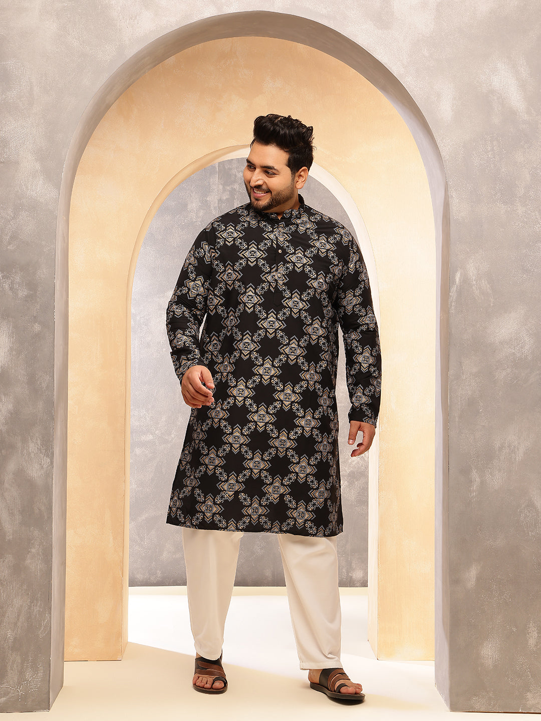 Men's Printed Cotton Linen Black Kurta With White Pyjama