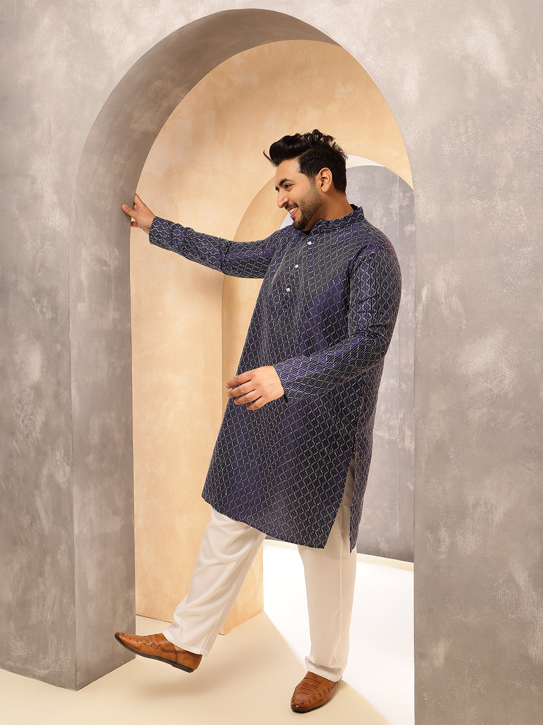 Men's Silk Blend Contrast Thread Embroidered Navy Kurta with Pyjama