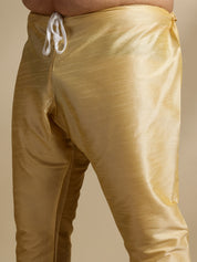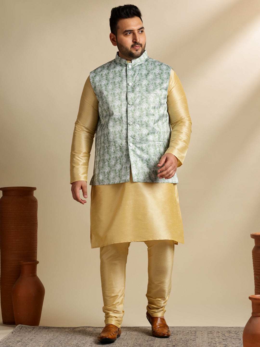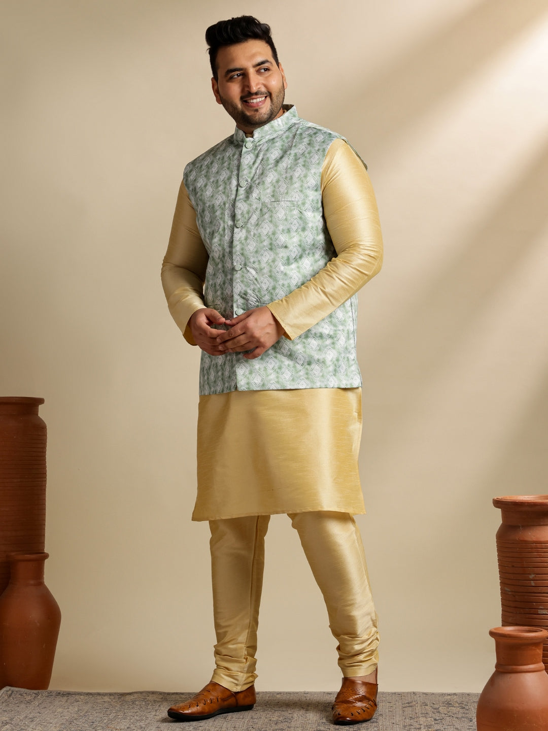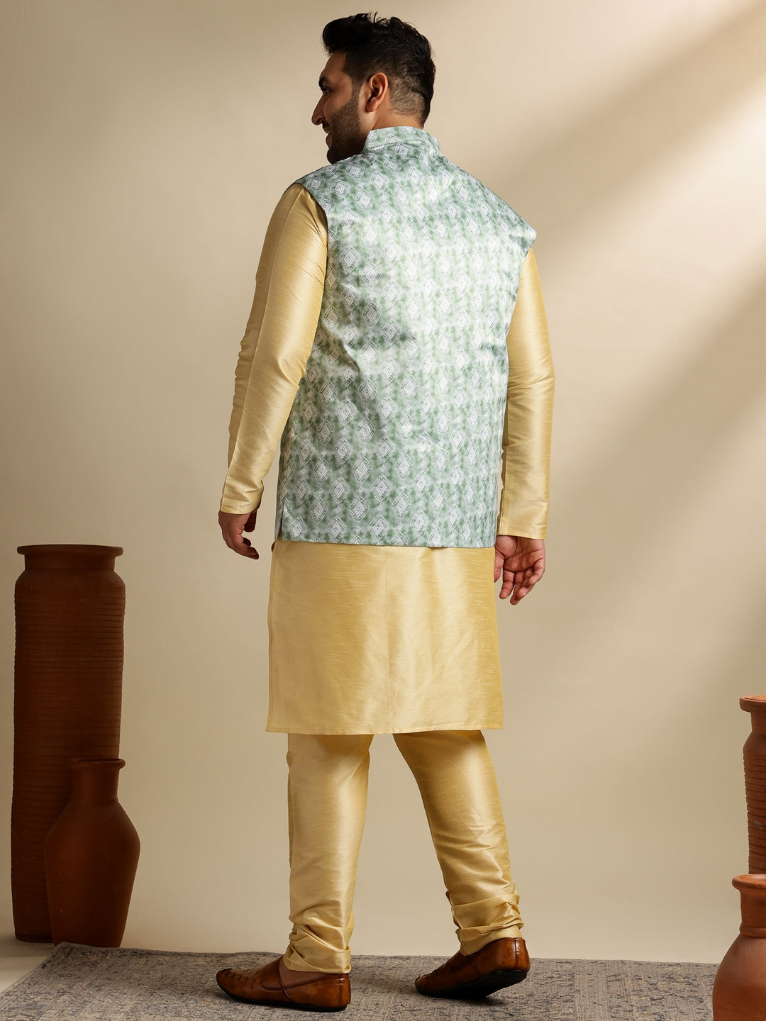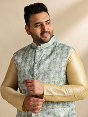 Men's Silk Blend Gold Kurta & Pyjama With Printed Green Nehru Jacket