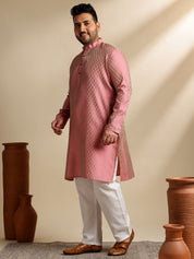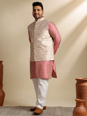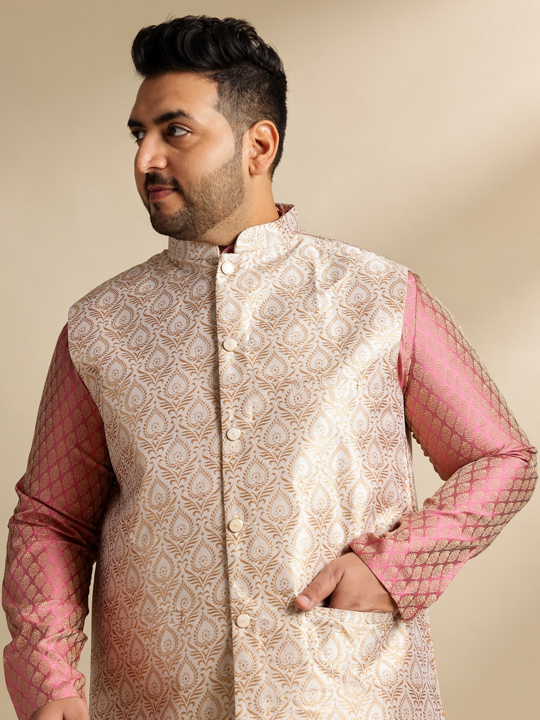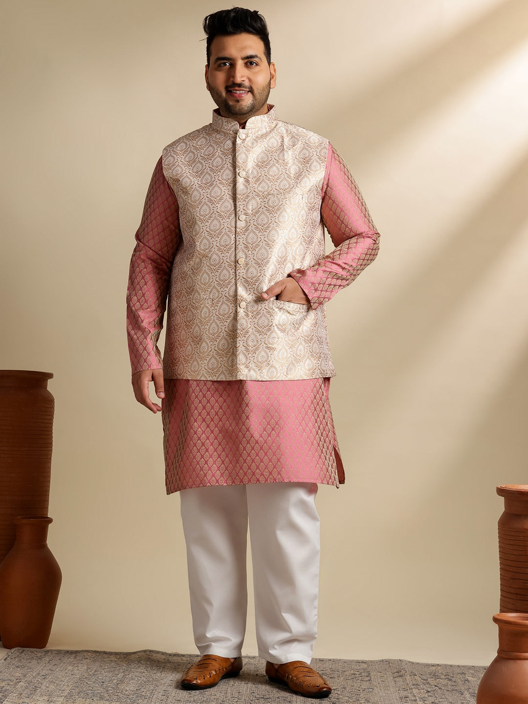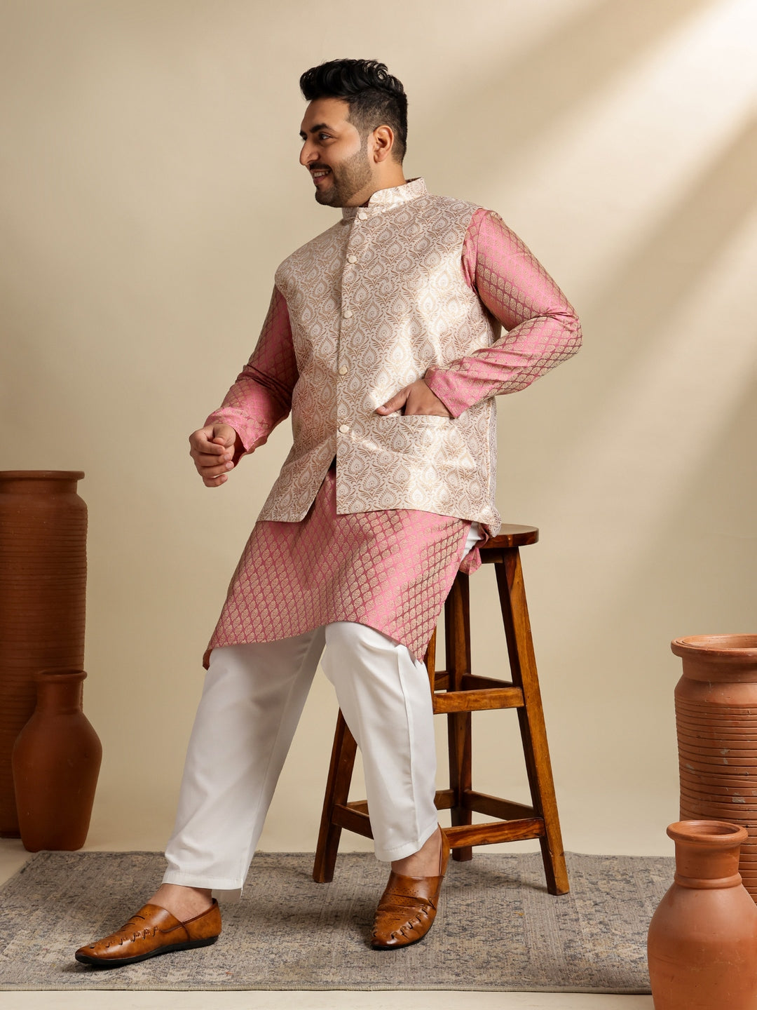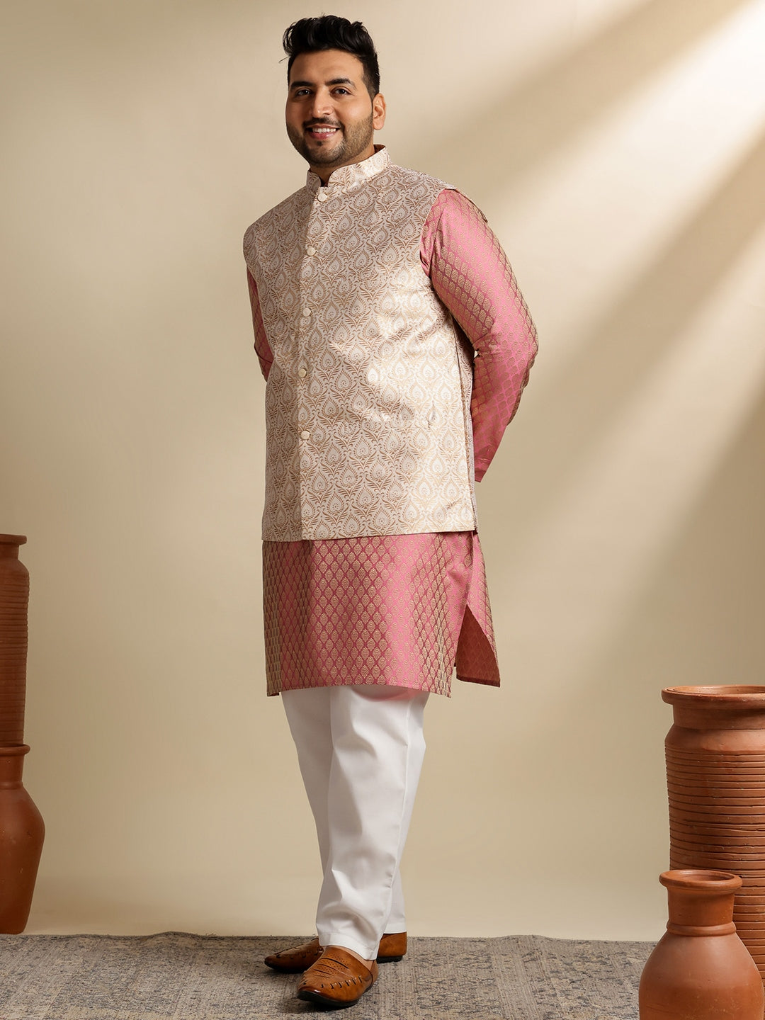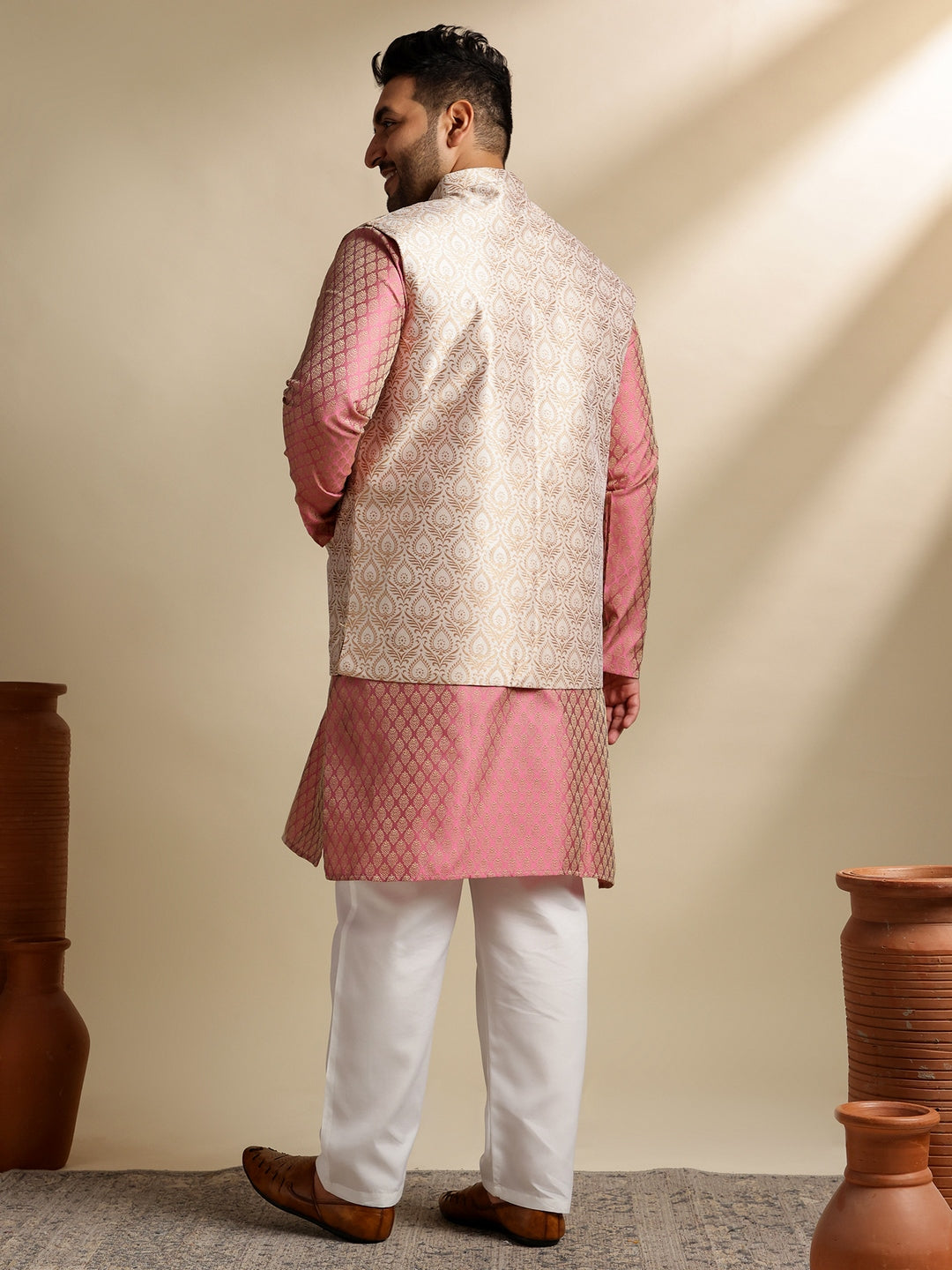 Men's Silk Blend Paisley Pink Kurta With White Pyjama & Cream Nehru Jacket