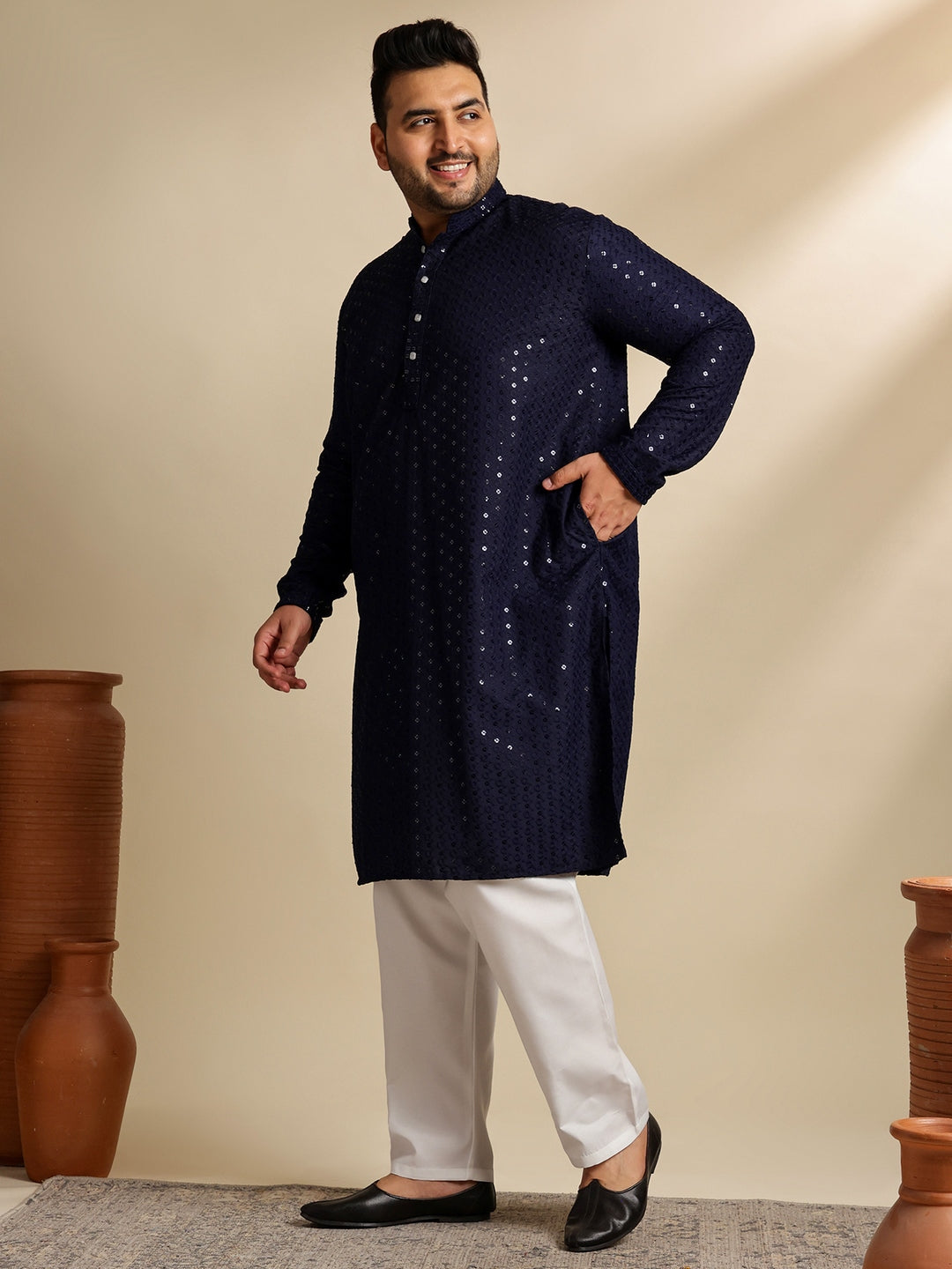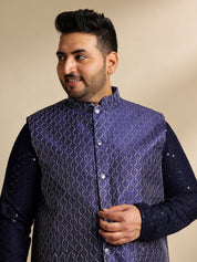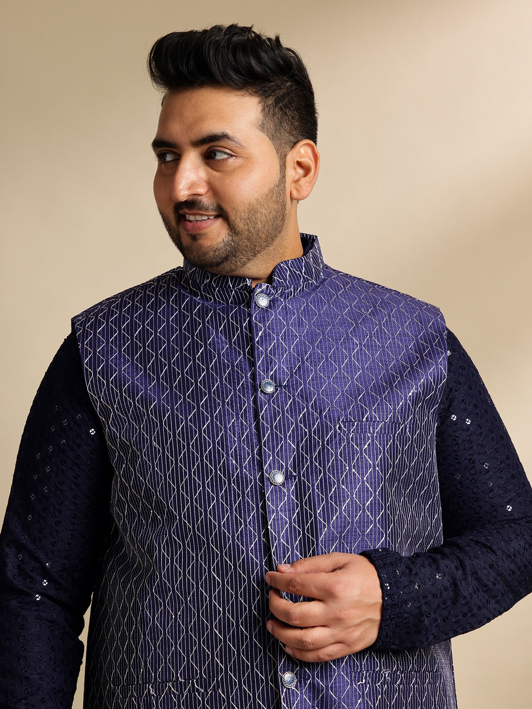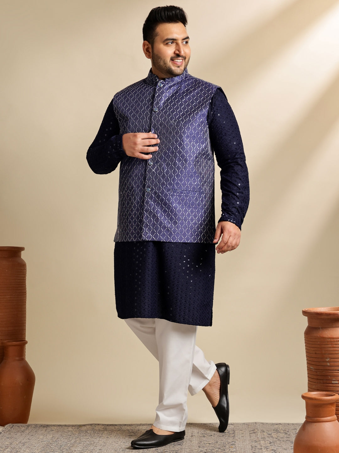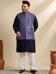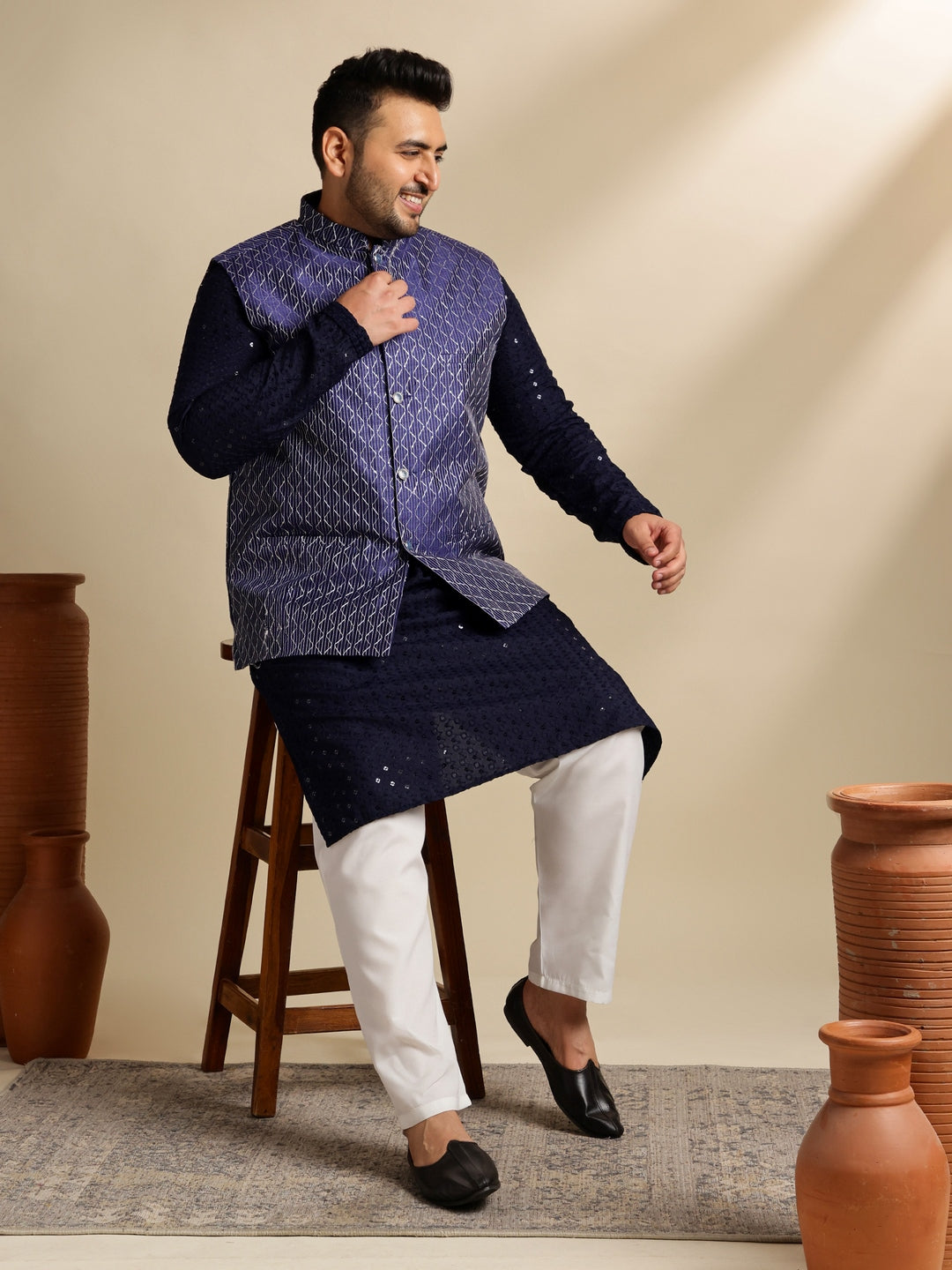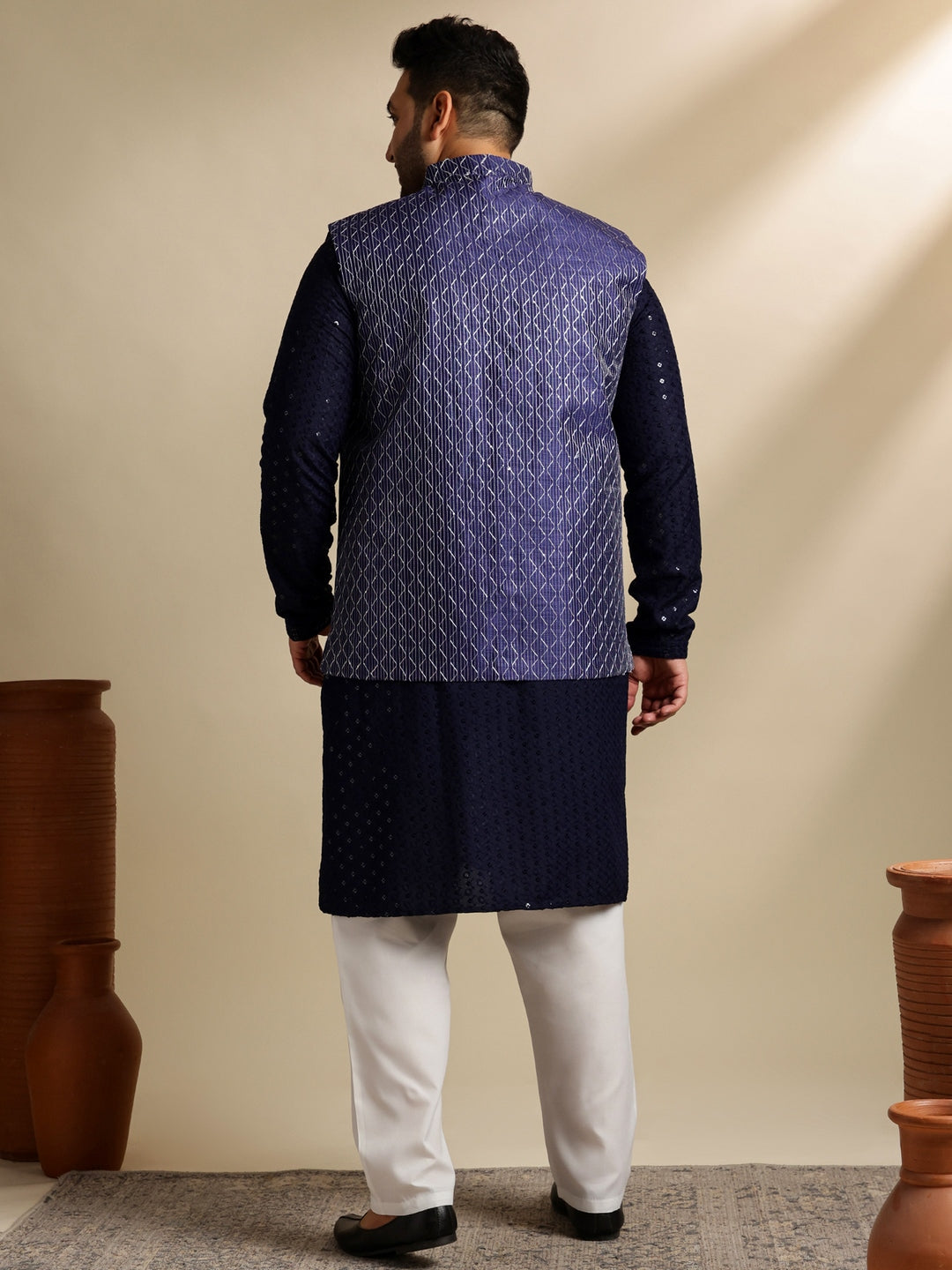 Sojanya Plus (Since 1958) Men's Cotton Embroidered Navy Kurta With White Pyjama & Navy Nehru Jacket