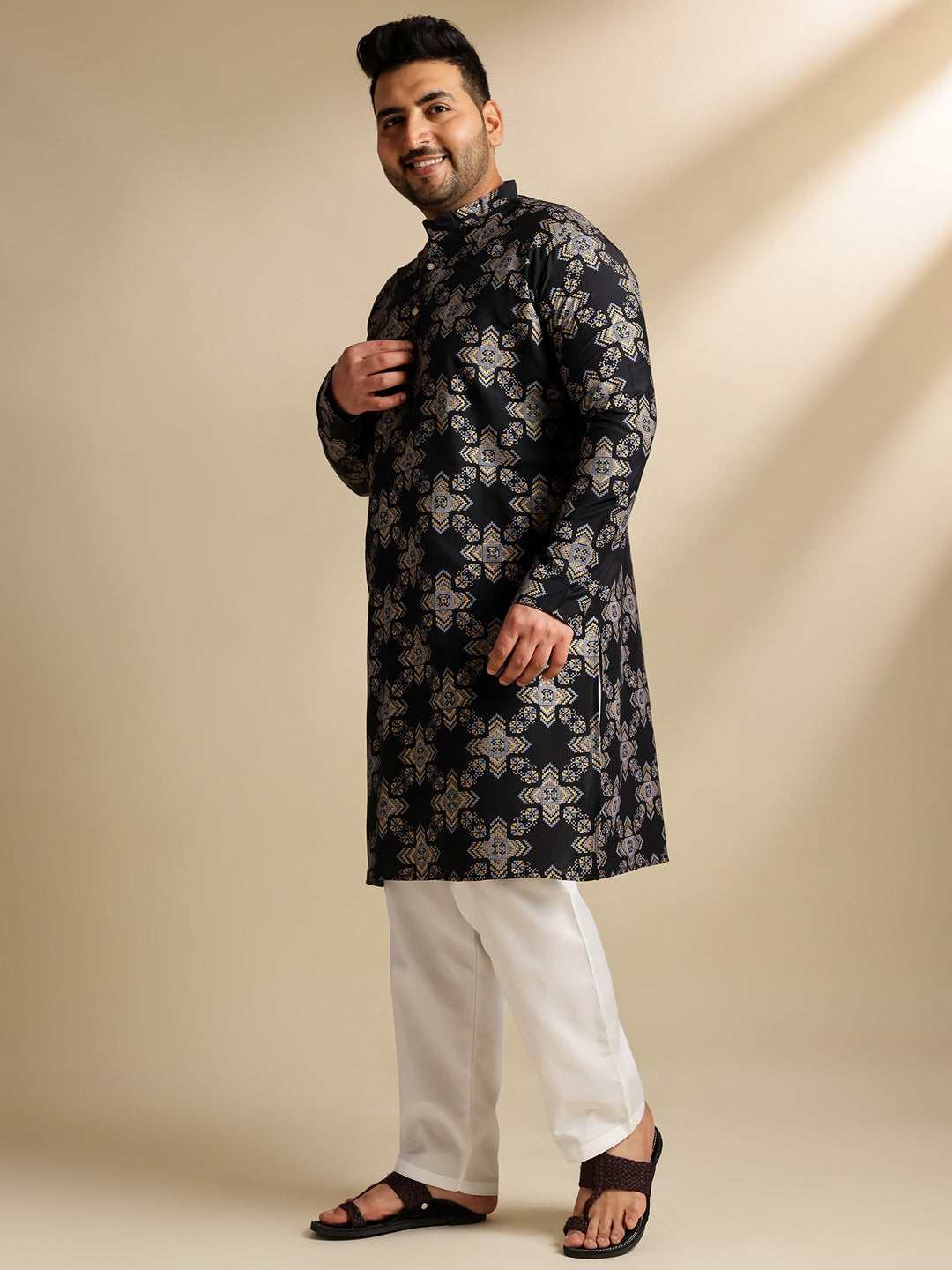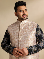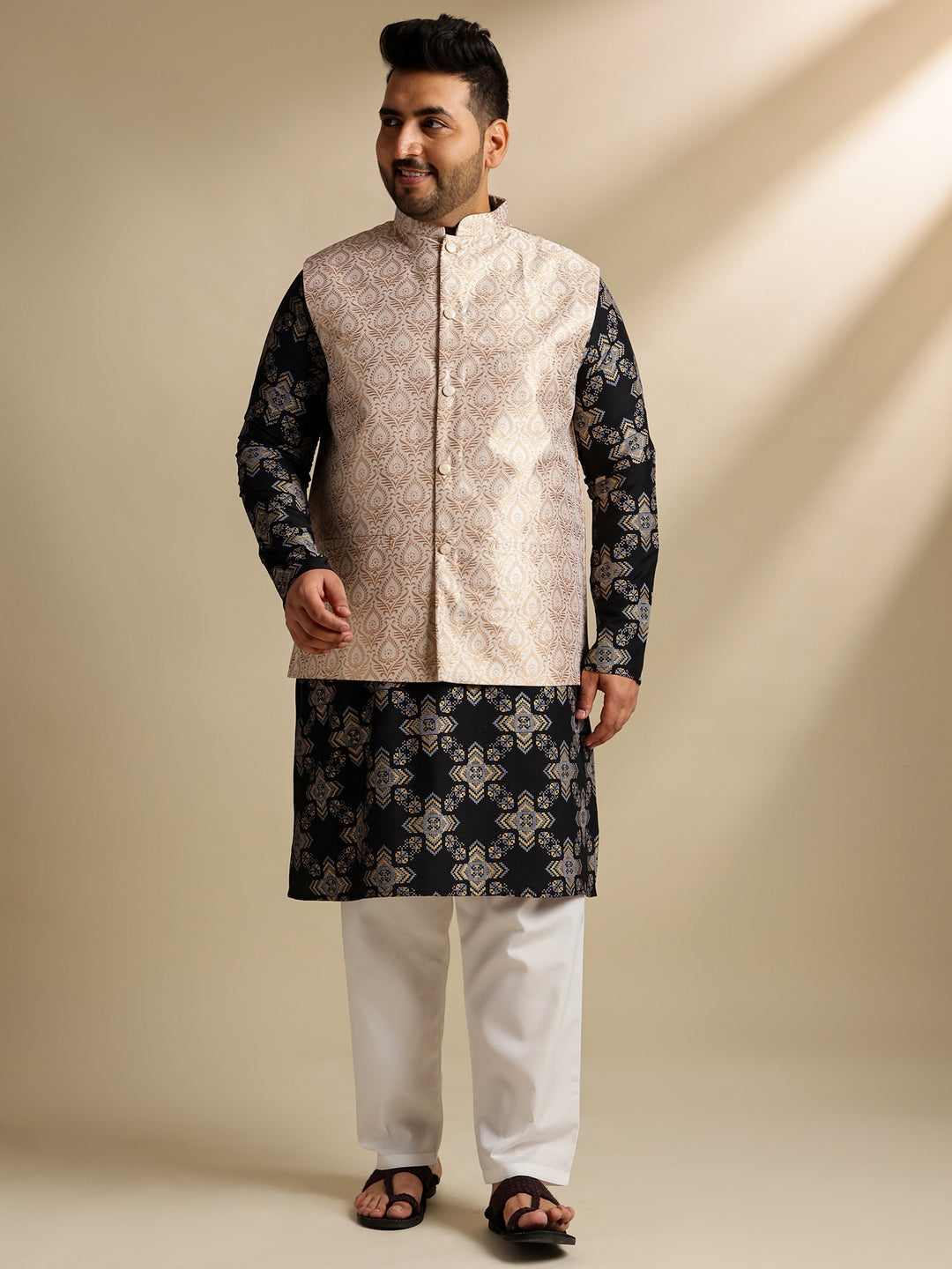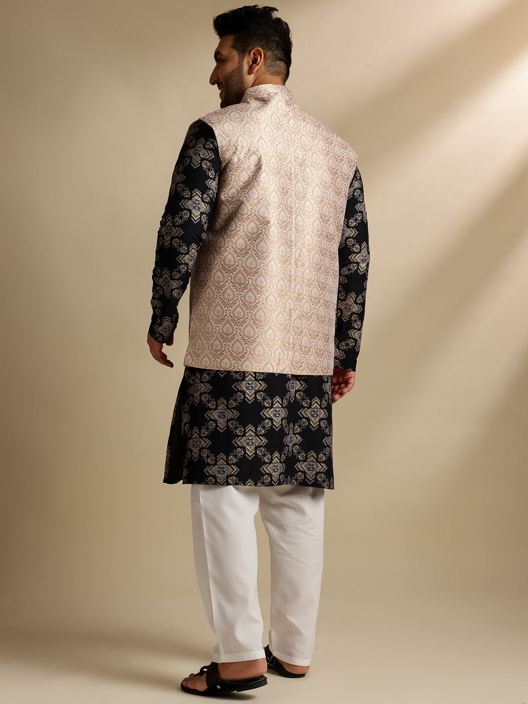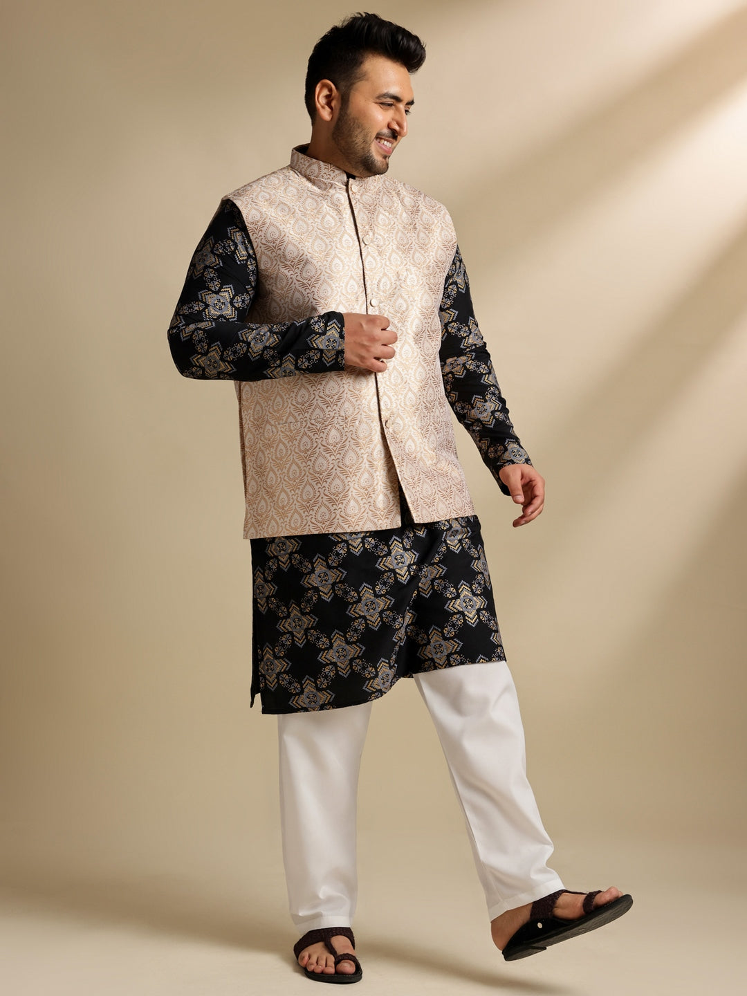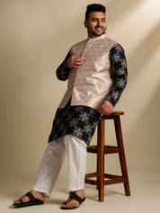 Sojanya PLUS (Since 1958) Men's Cotton Linen Printed Black Kurta & Pyjama With Cream Nehru Jacket