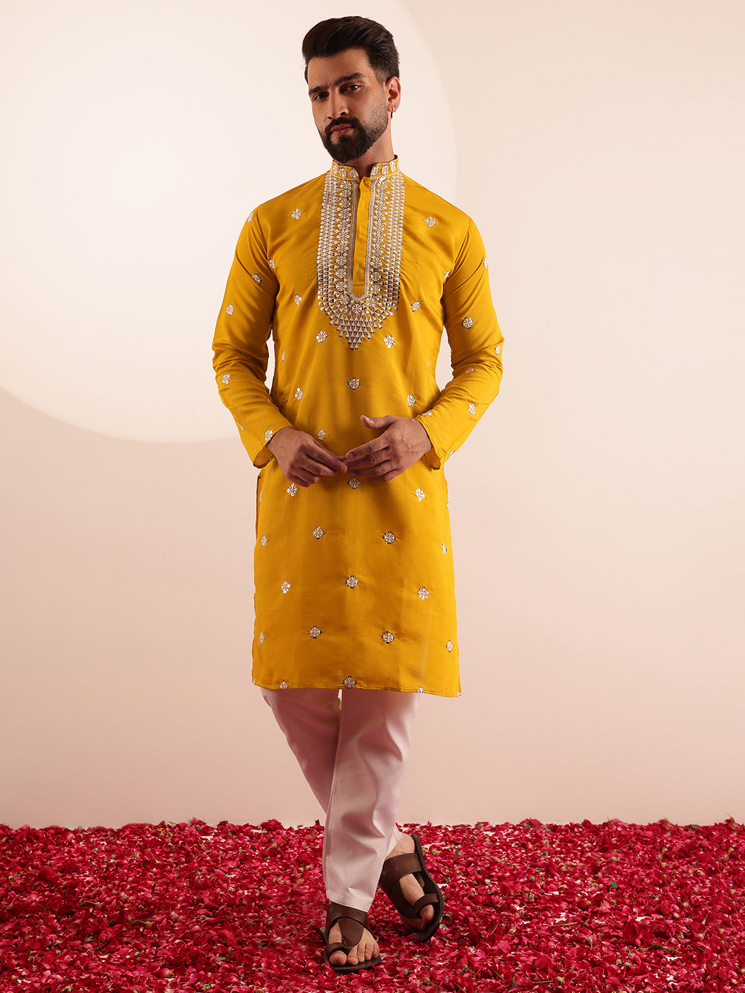 Men's Cotton Silk Neck Embroidered Mustard Kurta with White Pyjama